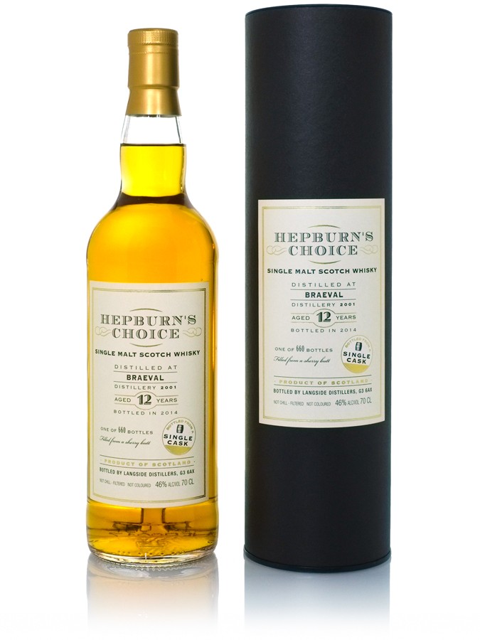 Single Malt - 46% - 70cl - Ecosse SpeysideCette expression single cask (660 bouteilles) millésime 2001 de Braeval fait partie de la série Hepburn’s Choice qui sort des sentiers battus pour offrir un éventail représentatif des différentes régions d’Ecosse et de distilleries spécifiques. Braeval est un malt du Speyside utilisé dans la composition du blend Chivas Regal et régulièrement embouteillé par des négociants dans des versions sherry crémeuses et onctueuses.