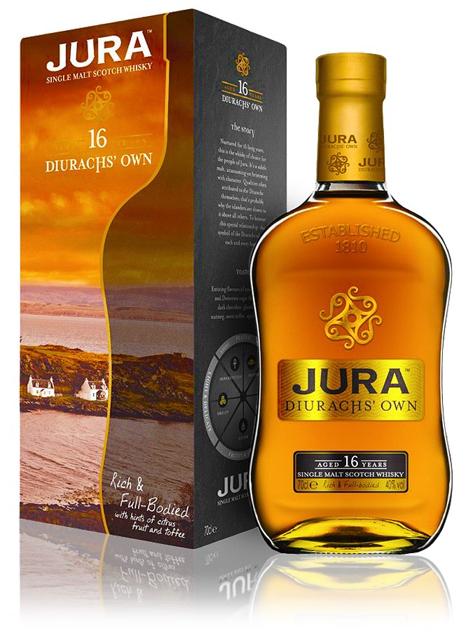 Single Malt - 40 % - 70 cl - Ecosse JuraLe malt non tourbé de la distillerie donne naissance à un Jura 16 ans riche et délicat qui mélange douceur et fermeté. La maturation de ce single malt est originale : 90% du distillat vieilli dans des fûts de chêne blanc américain et les 10% restants vieillissent dans des fûts de xérès oloroso. Il en résulte un whisky d’une grande finesse, à la robe cuivrée. L’estampille de la bouteille indique que c’est le whisky préféré des habitants : « Diurachs’ Own » ou le « choix des habitants de l’île de Jura ».
